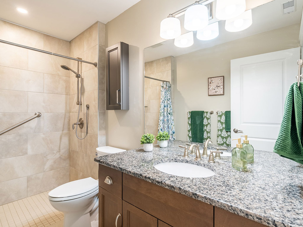 The full bathroom features a curb-less shower with 2 grab bars and overhead light