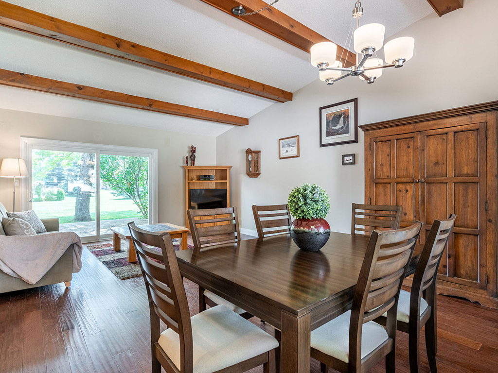 Vaulted ceilings in the living/dining room with beautiful wood beams