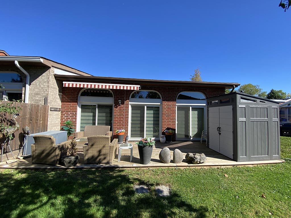 • The backyard features an extended deck, retractable awning and overlooks a green space