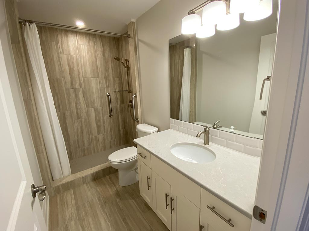 • Bathroom features a step-in shower with overhead light and grab-bar plus a large vanity which provides ample storage space
