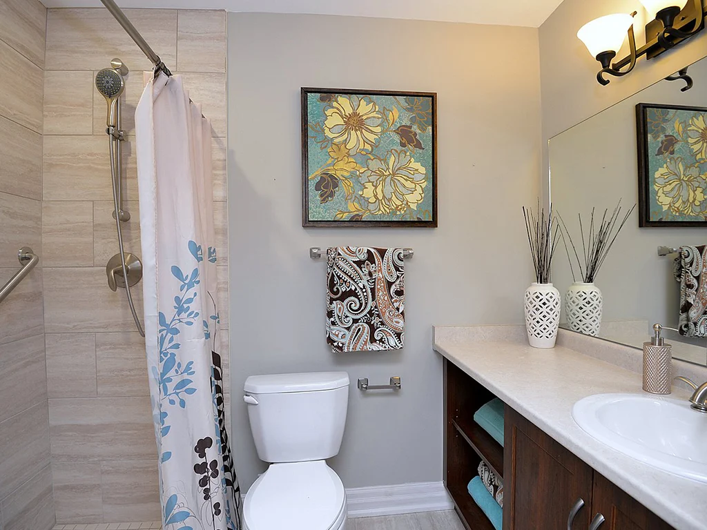 - Bedroom includes a walk-in closet and ensuite bathroom, complete with walk-in shower that contains two grab-bars