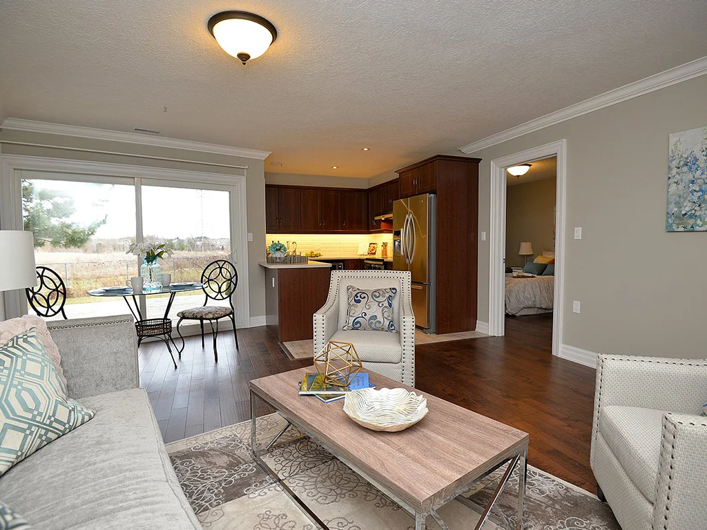 - Open-concept kitchen and living space which has access to the backyard