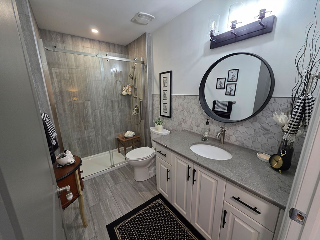• Bathroom includes a walk-in shower with overhead lights and recently installed glass shower doors plus a large vanity