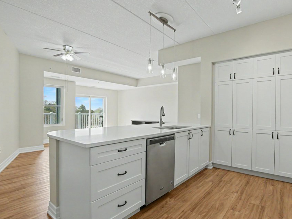 Bright, sunny living awaits in the Upper Mill Pond at St. Elizabeth Village, a gated 55 plus community offering independent, maintenance free living. This larger one bedroom, one bathroom unit features a tiled walk in shower and an open concept kitchen with ample storage and a generous peninsula with overhang for barstools, perfect for morning coffee or casual entertaining. The living and dining area opens to a south facing balcony that fills the home with all day sun and overlooks tranquil ponds and lush greenspace. Enjoy the convenience of in building amenities including a heated indoor pool, gym, saunas, hot tub and golf simulator without leaving the building. Exclusive underground parking and storage locker also come with the unit for your convenience. The Village offers creative outlets with a woodworking shop and hobby shop, plus on site services such as a medical clinic, cafe, pharmacy, hair salon, massage clinic and public transportation. This home combines comfort, convenience and community for a joyful, maintenance free lifestyle. Schedule a showing and feel the warmth of Upper Mill Pond living. CONDO Fees Incl: Gas, water, and all exterior maintenance.